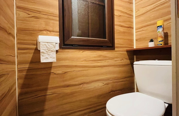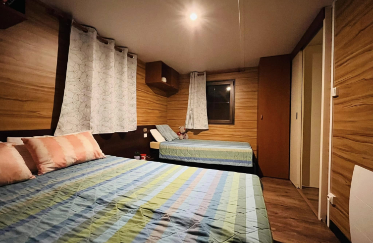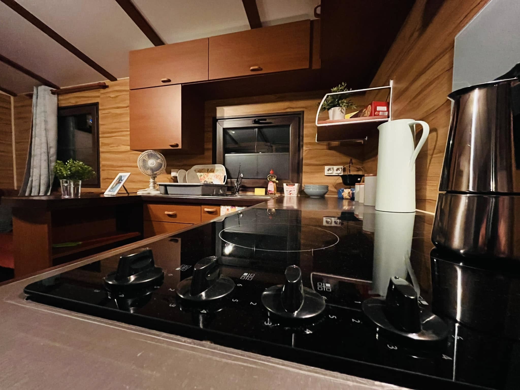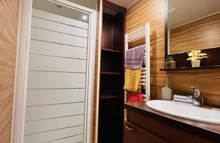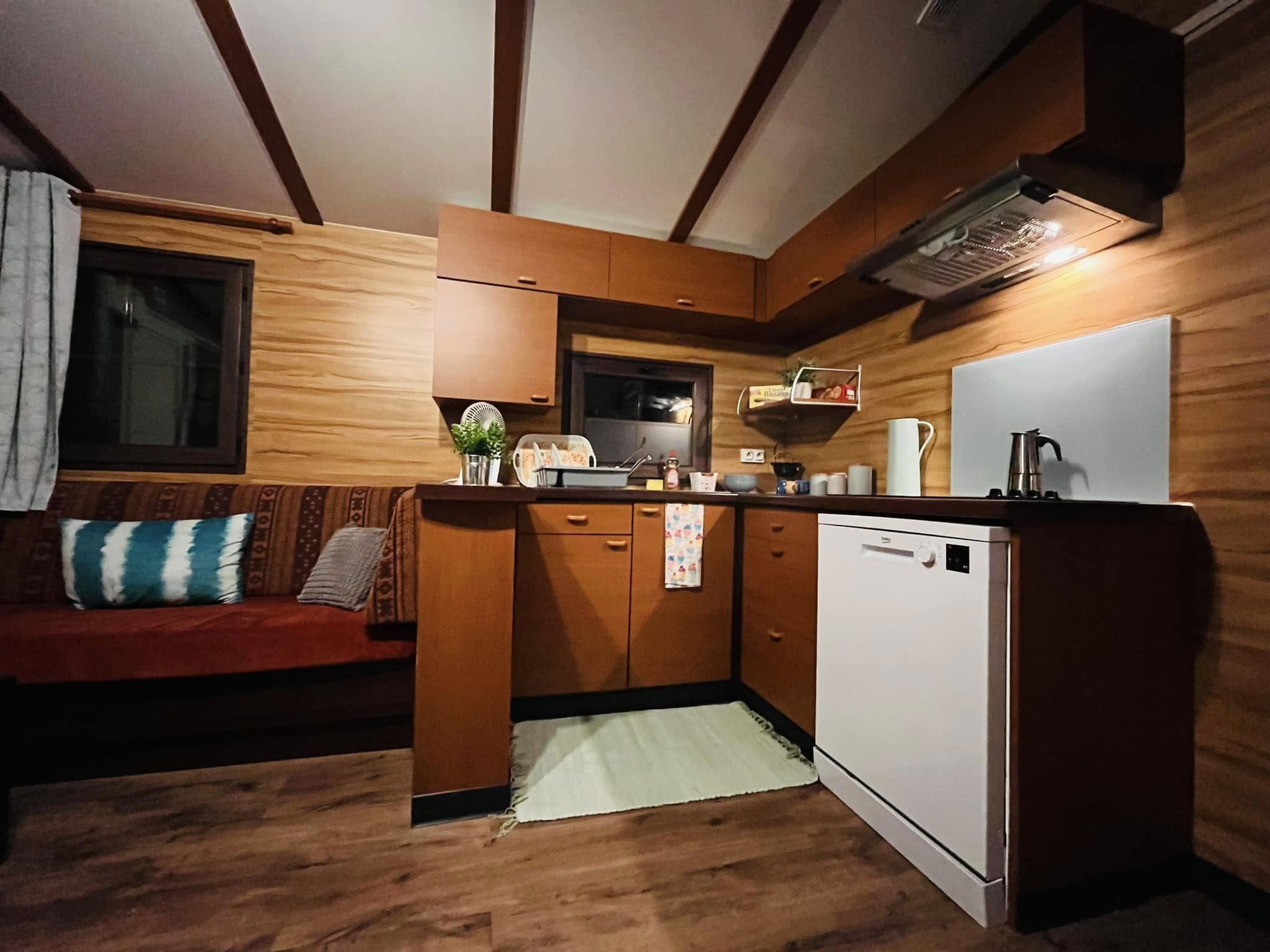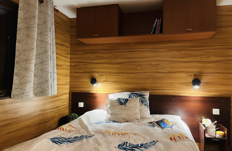 Kívülről azonnal magával ragad a gondozásmentes kompozit borítás, amely időtálló védelmet biztosít. A modern kültéri lámpák mozgásérzékelőkkel egészülnek ki, a háromtagú tolóajtó és a külön bejárati ajtó pedig elegáns, otthonos megjelenést ad. A horganyzott, dupla tengelyes alváz közel 7,5 tonnás stabilitást garantál, a szigetelt falak és aljzat pedig biztosítják a négyévszakos használhatóságot.