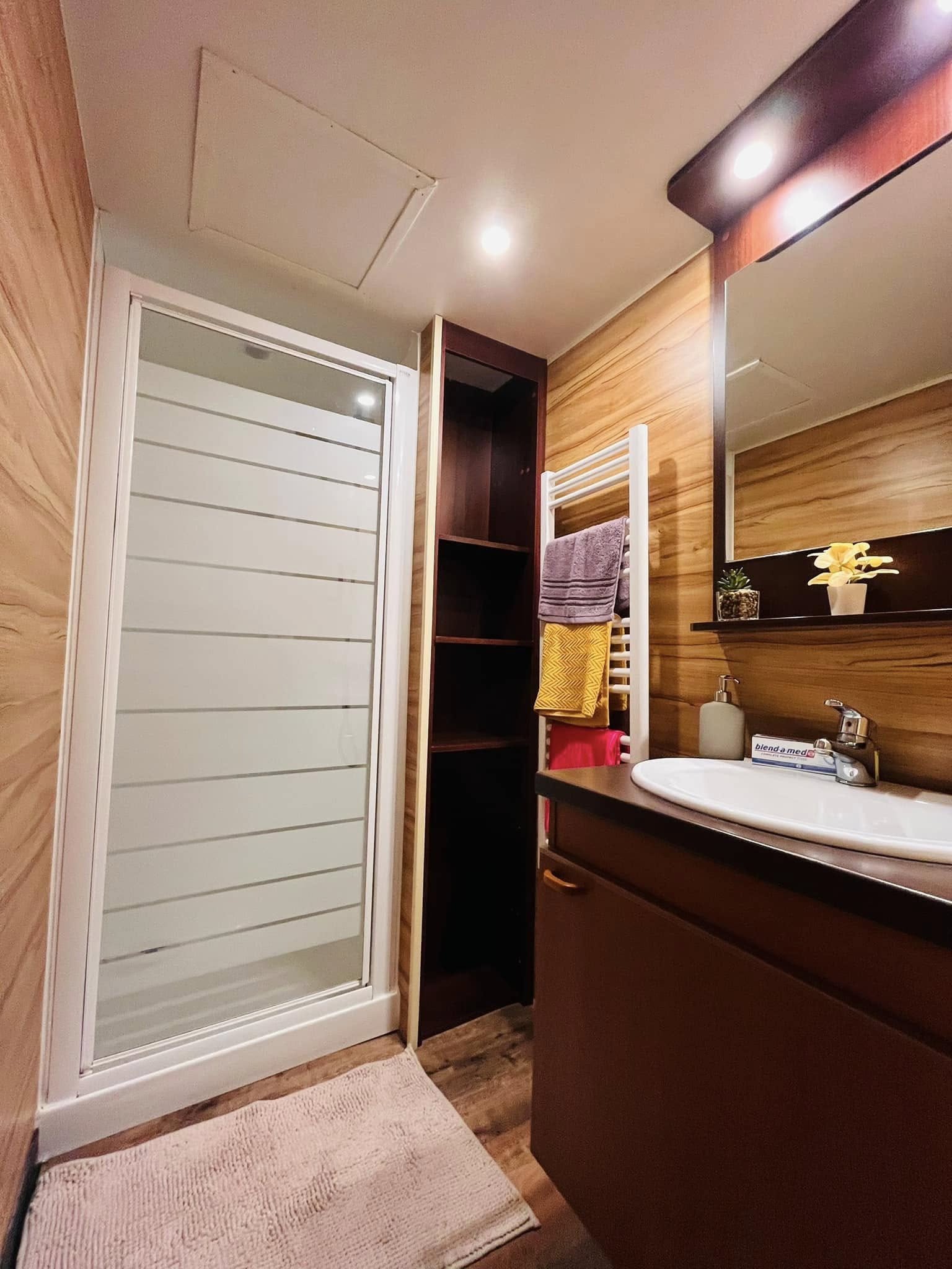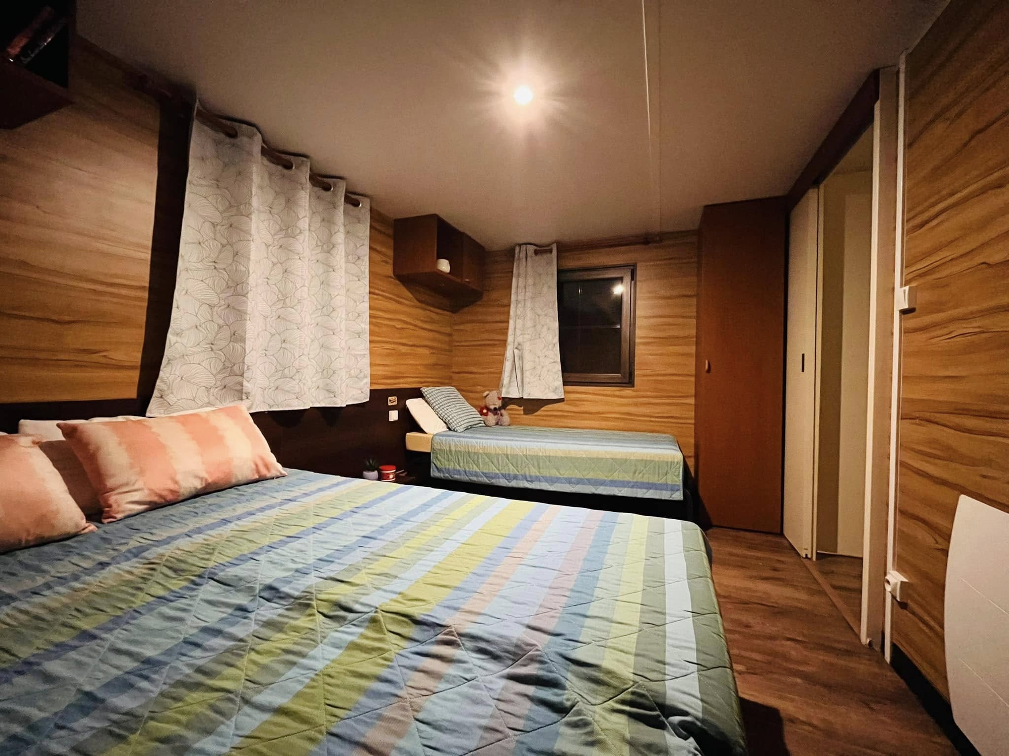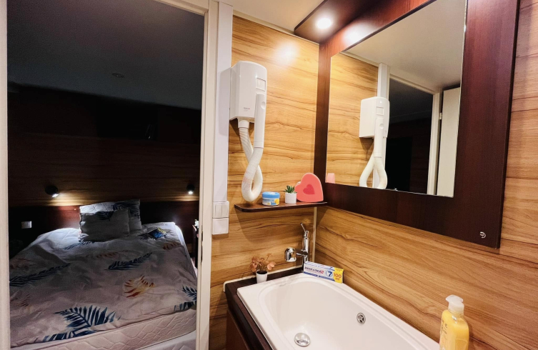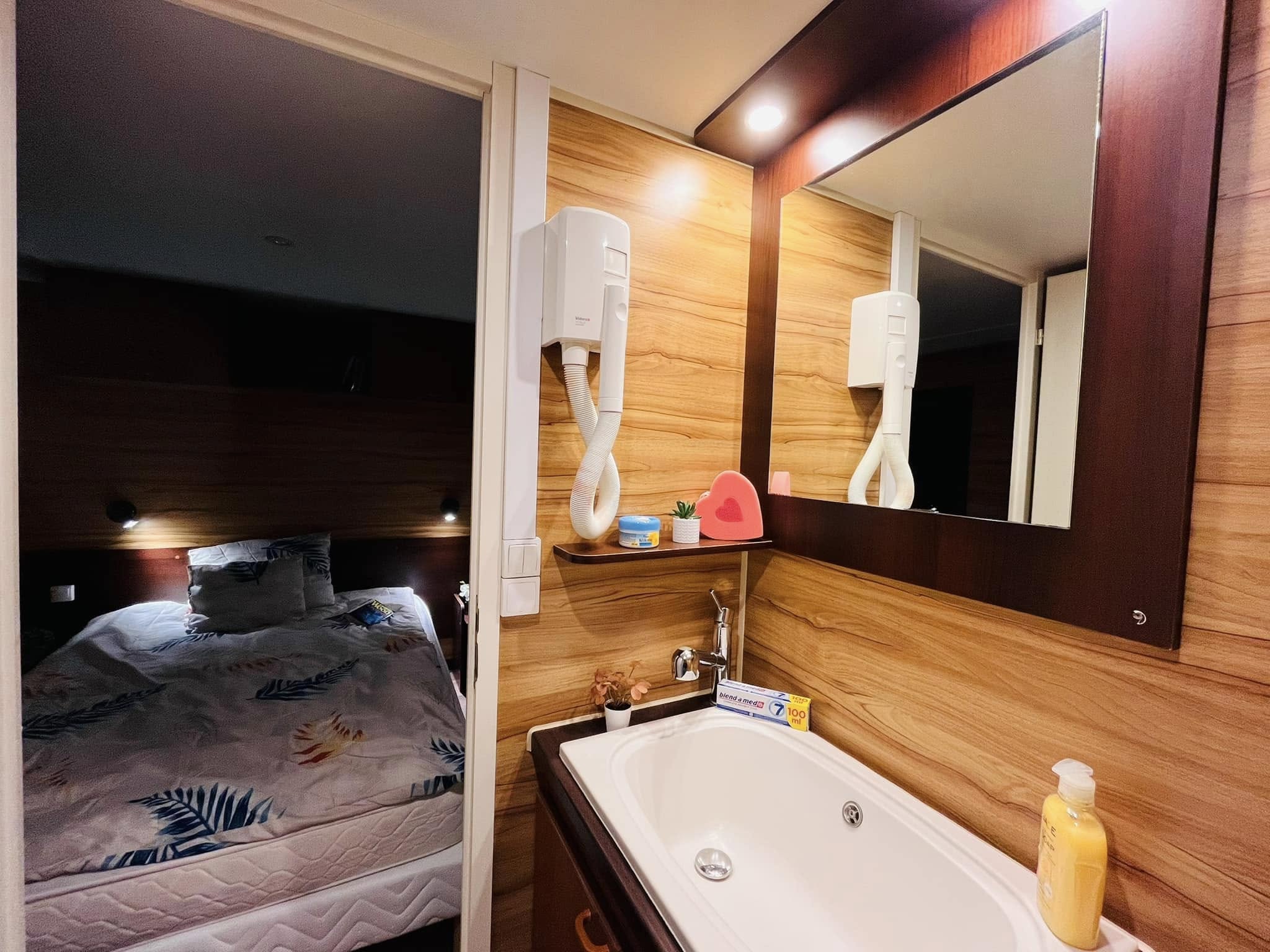 Kívülről azonnal magával ragad a gondozásmentes kompozit borítás, amely időtálló védelmet biztosít. A modern kültéri lámpák mozgásérzékelőkkel egészülnek ki, a háromtagú tolóajtó és a külön bejárati ajtó pedig elegáns, otthonos megjelenést ad. A horganyzott, dupla tengelyes alváz közel 7,5 tonnás stabilitást garantál, a szigetelt falak és aljzat pedig biztosítják a négyévszakos használhatóságot.